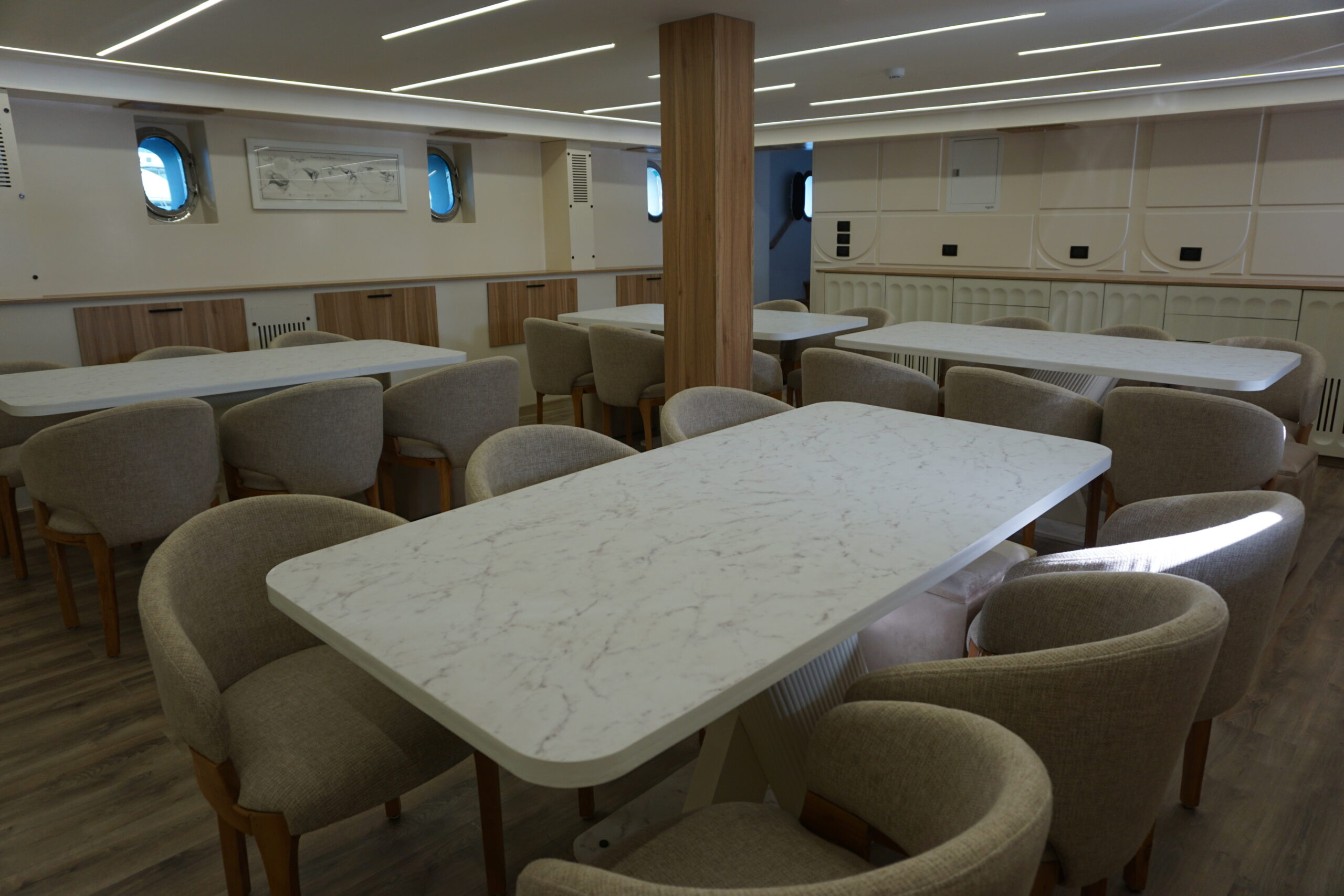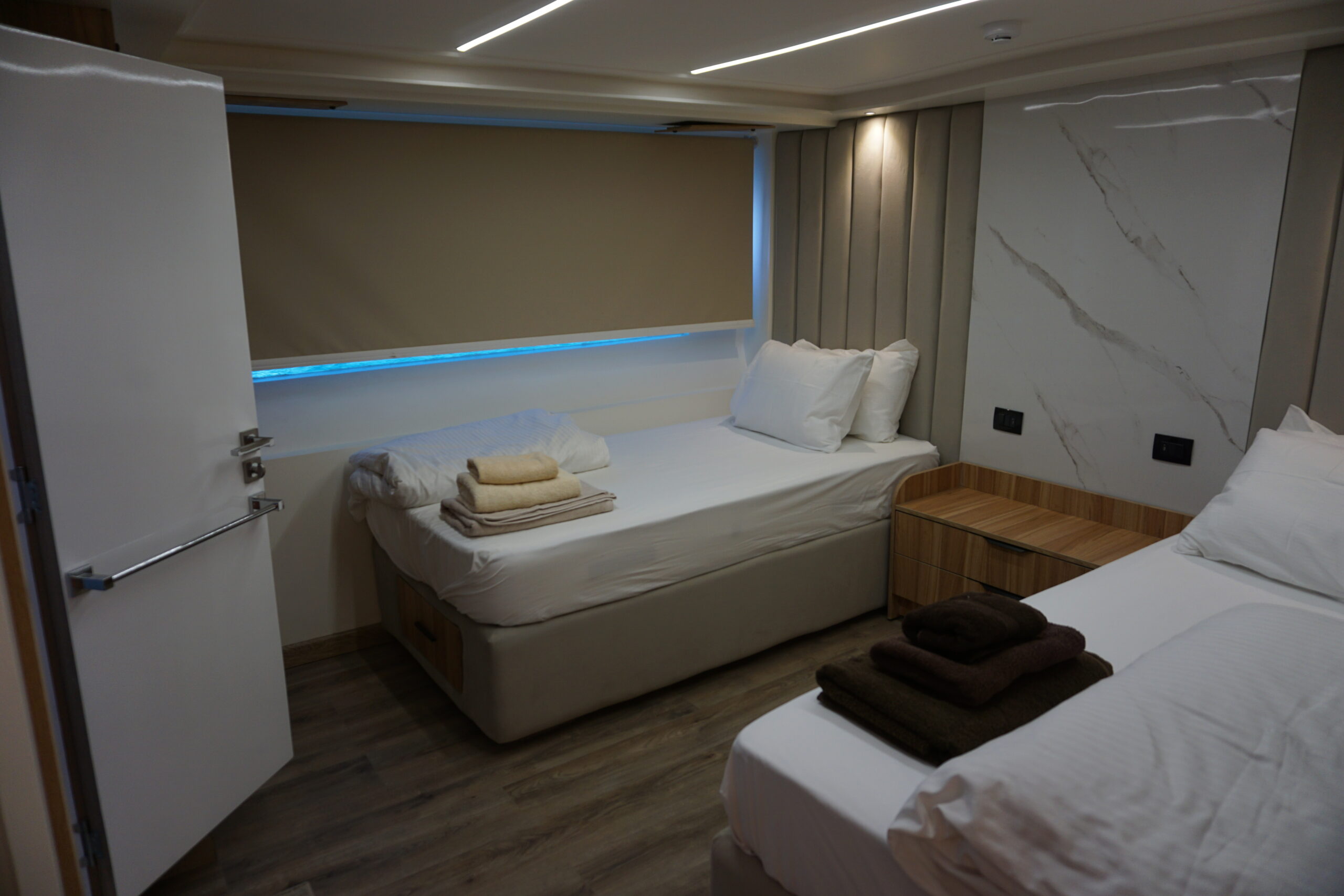Maksimum 26 kişi kapasiteli -10 double, 2 triple, banyo ve duşlu kabin -Klima -Kabinlerde müzik sistemi -Salonda Bar, Plazma tv, DVD ve müzik